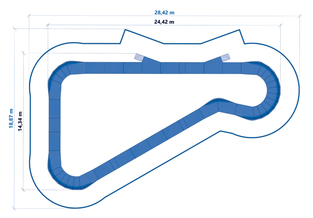 Ein kompaktes Streckenlayout mit 36 Metern Fahrbahnlänge. Passt auf jede Fläche und eignet sich perfekt für Messen und Indoorevents.